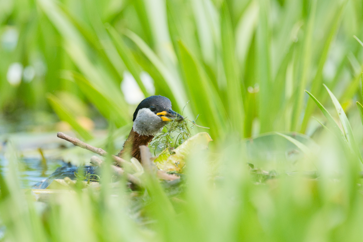 Ein Rothalstaucher schwimmt zwischen den Wasserpflanzen.