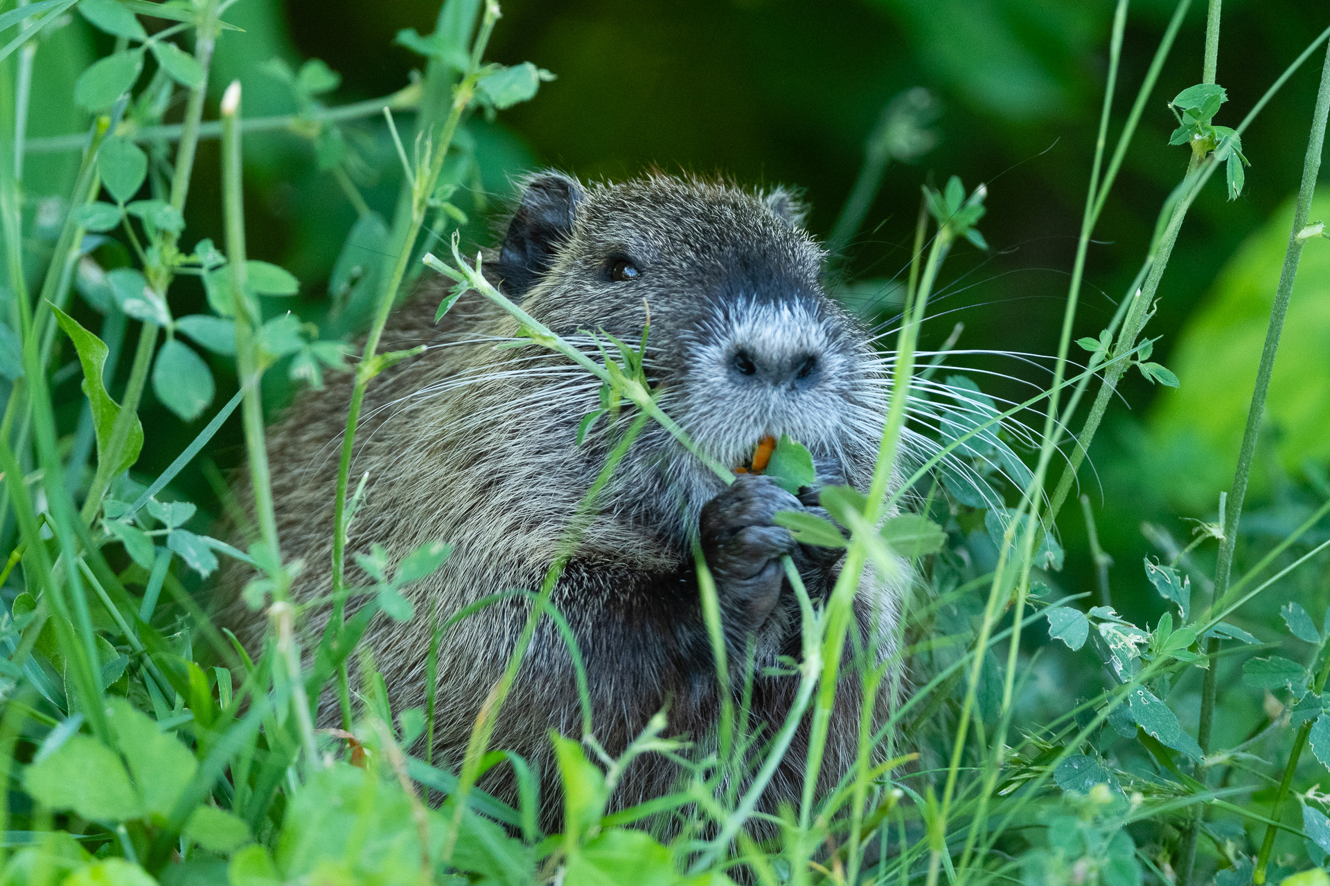 Junges Nutria im Gras bei der Nahrungsaufnahme.