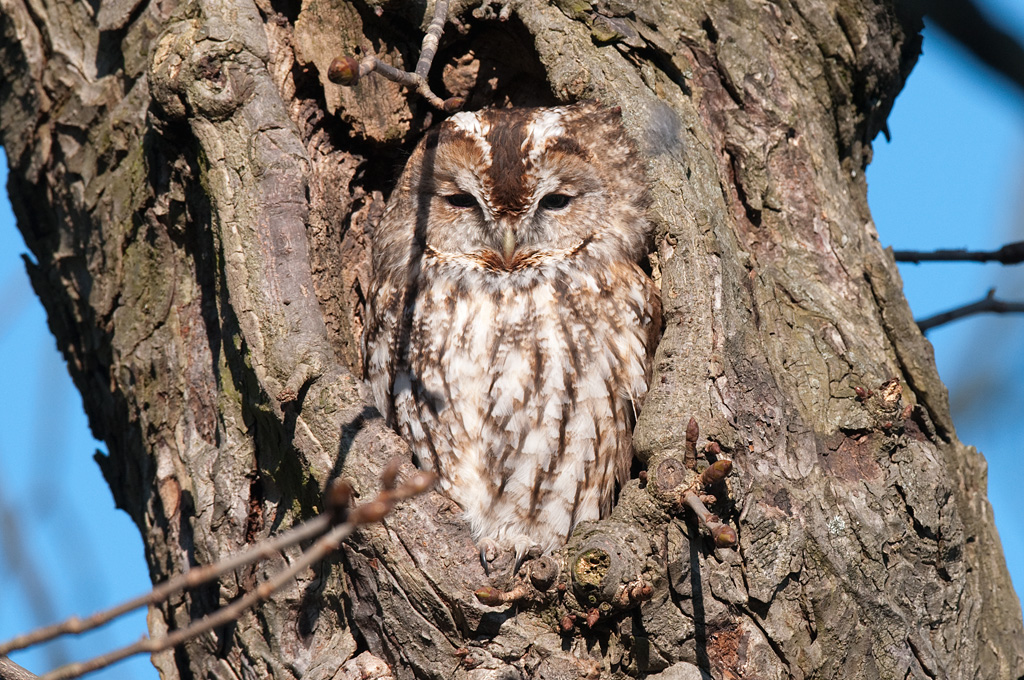 Ein Waldkauz geniesst die Sonne.
